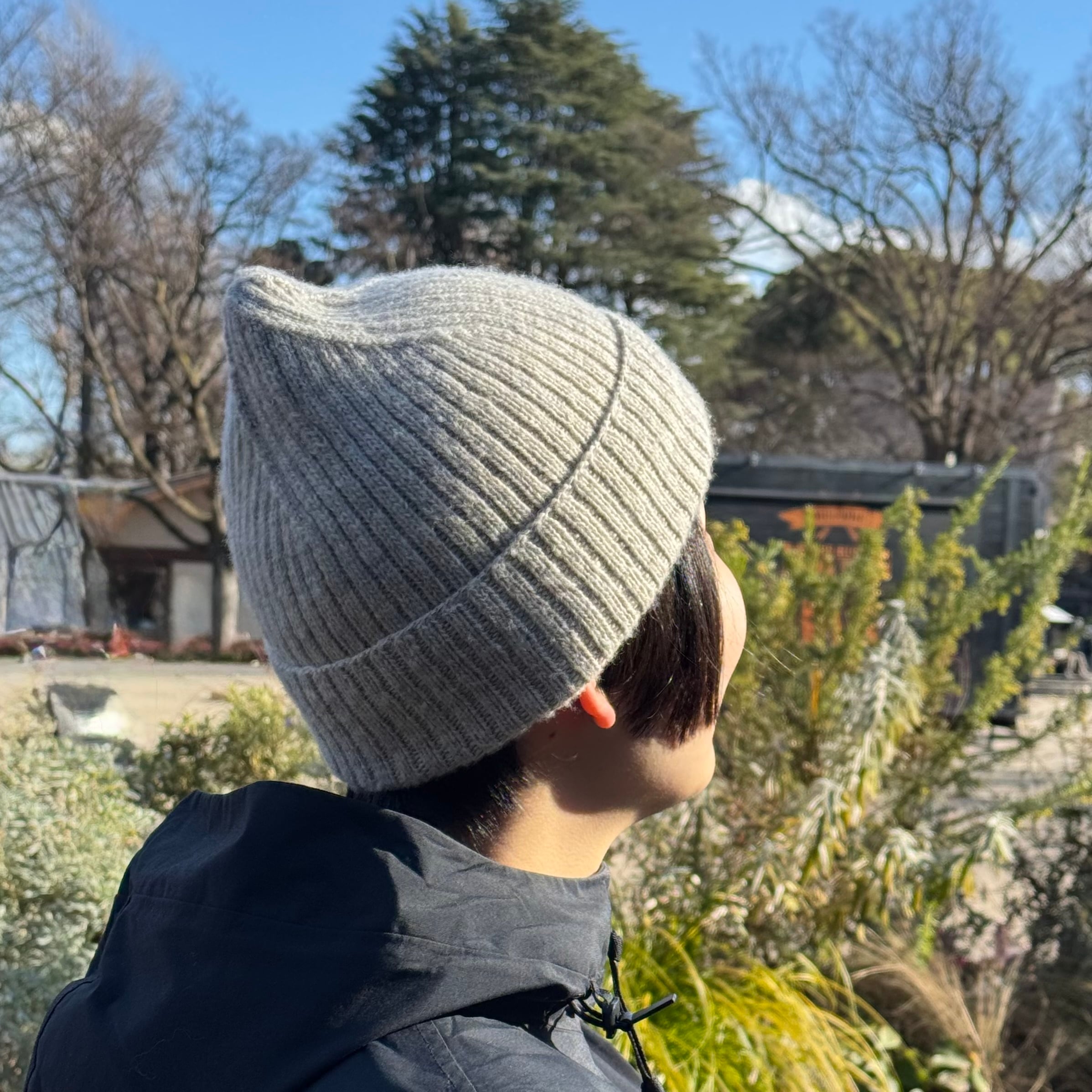 頭の丸みから流れるようなやさしい三角のトップは、深くかぶると頭の形に自然に沿うように丸くなじむので、かぶり方でアレンジも楽しめます。